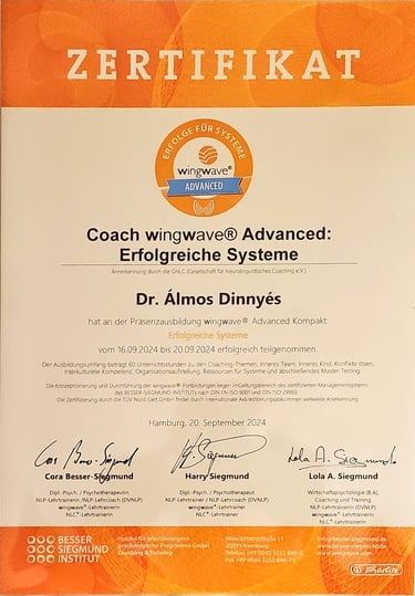 Németül elvégeztem a Besser-Siegmund Institut hipno-coach képzését, tagja vagyok az intézet által fenntartott szakmai szervezetnek. Emellett folytattam a jóval korábban elkezdett NLP tanulmányaimat az angol nyelvű Achology (Academy of Modern Applied Psychology) kurzusain. Itt NLP practitioner, majd hypnotherapy practitioner végzettséget szereztem. Jelenleg az NLP master képzésben veszek részt.