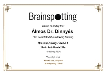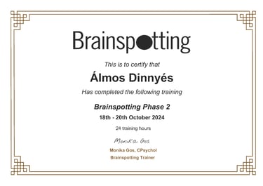 2024-ben ismerkedtem meg a Brainspotting módszerrel, egy olyan traumakezelési módszerrel, amely részben hipnózisra épül. Az Brainspotting Ireland képzései közül elvégeztem az első két fázist, jelenleg a practitioner cím megszerzésén dolgozom.